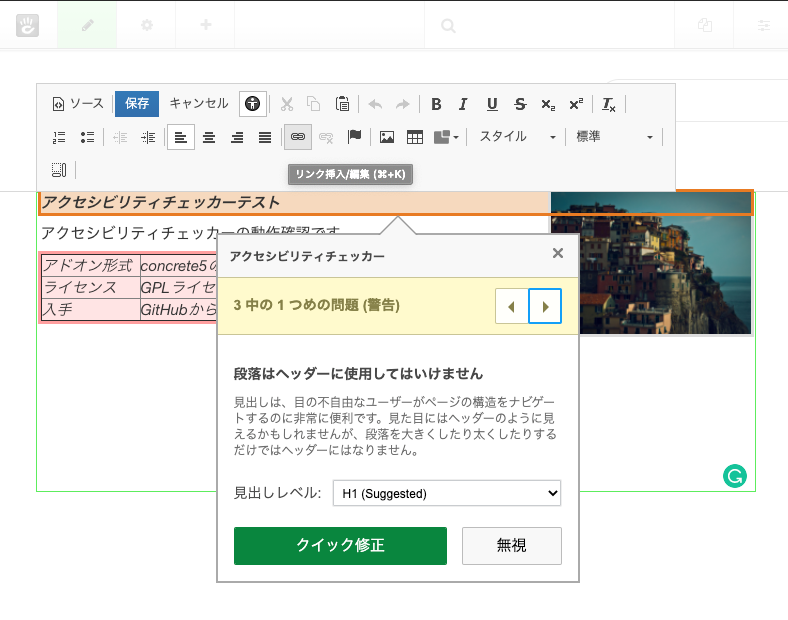 以上の準備で、記事ブロック内にアクセシビリティチェッカーボタンが出現し、クリックするとコンテンツ中のアクセシビリティ上の問題を分かりやすく表示してくれます。