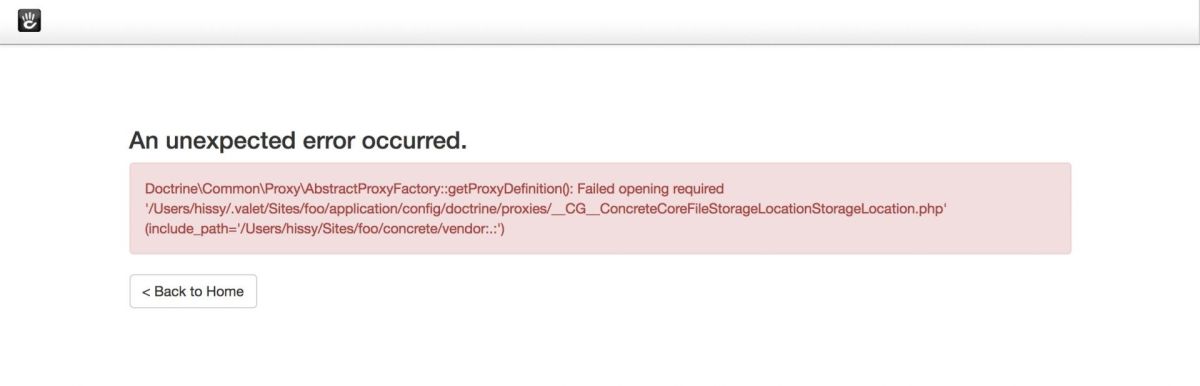 Doctrine\Common\Proxy\AbstractProxyFactory::getProxyDefinition(): Failed opening required '/Users/hissy/.valet/Sites/foo/application/config/doctrine/proxies/__CG__ConcreteCoreFileStorageLocationStorageLocation.php' (include_path='/Users/hissy/Sites/foo/concrete/vendor:.:')