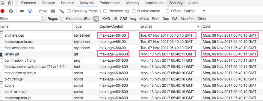 cssファイルを見ると「max-age=86400」となっており、1日間の秒数に設定されていることが分かります。