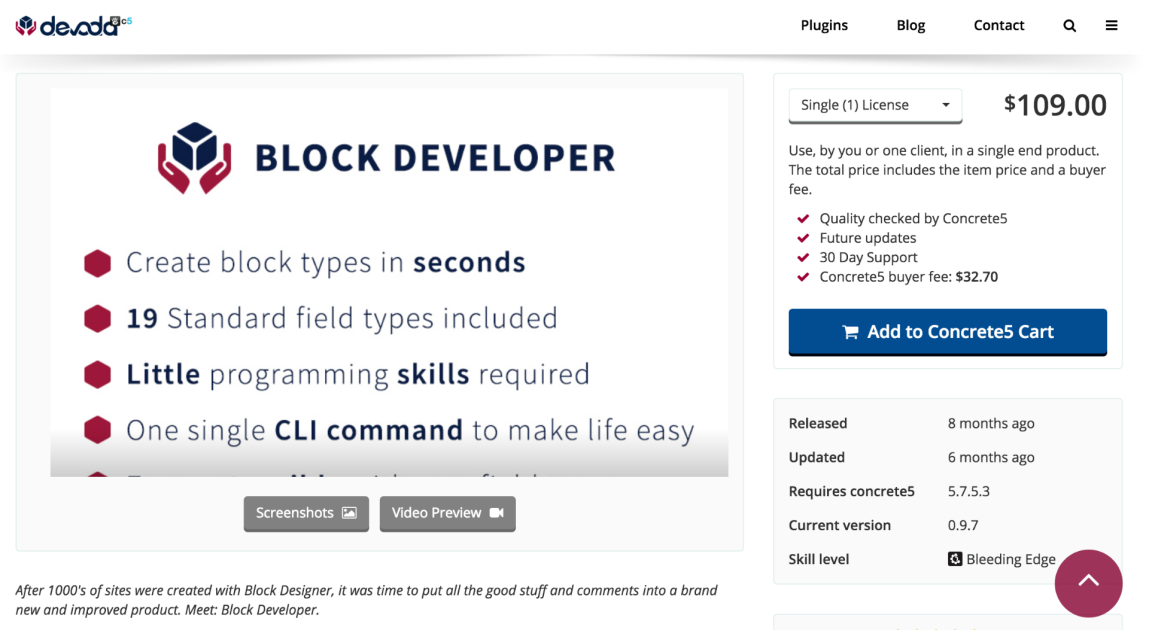 Block Developer は、109ドル(2019年2月現在)で公式マーケットプレイスで販売されています。同じ開発者が Block Designer と Block Designer Pro というアドオンも公開していますが、管理画面からマウス操作でブロックが作成できる Block Designer と違って、Block Developer は管理画面がないなど、少し開発者向けの仕様になっています。ただ、その分、柔軟性が高いのが特徴です。また、Block Designer アドオンで作成したブロックは、一度アンインストールしないと設定変更ができないという制限がありましたが、Block Developer ではアンインストールせずにブロックの設定変更が可能です。これは、開発中に要件が変わるときに特に重宝します。