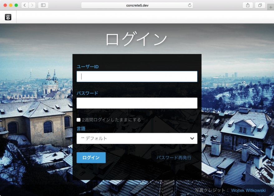 まず、concrete5 には美しいログイン機能が用意されており、ログインIDを持つユーザーは利用する言語を選択してログインすることができ、パスワードの再発行機能も搭載されています。