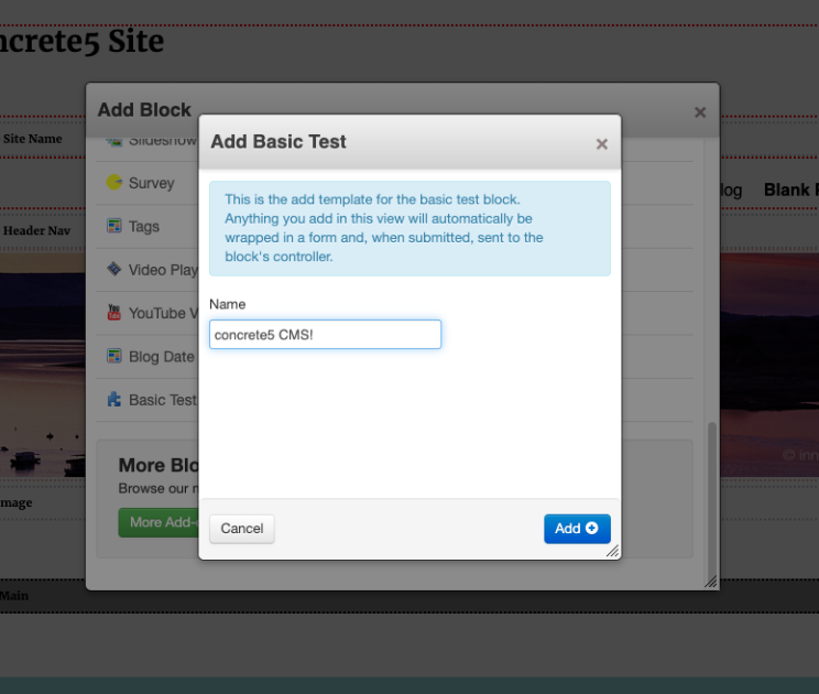 今回の解説にあたって、レガシー版のドキュメント「Creating a New Block Type」からダウンロードできるサンプルブロックを使います。このサンプルブロックをインストールすると、本記事のサムネイル画像のような1つの入力欄があるブロックタイプが利用できるようになります。このレガシー版のドキュメントもいつなくなるか分からないので、本記事からもダウンロードできるようにしておきます。